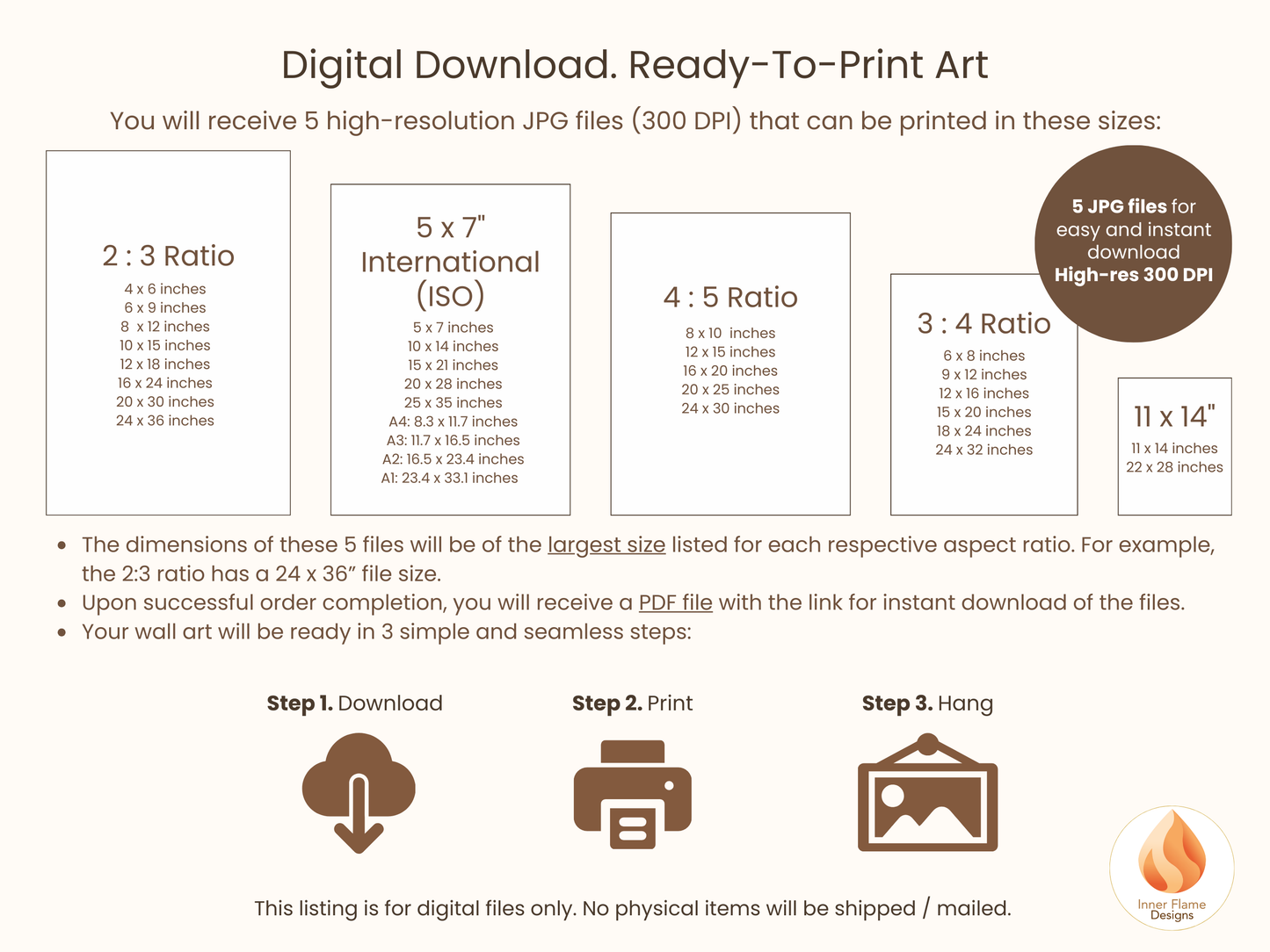 There are three designs in this wall art series. You will receive 1 Digital File in PDF which includes 5 high-resolution images (300 DPI) for each design in the following sizes available for download in JPG format: